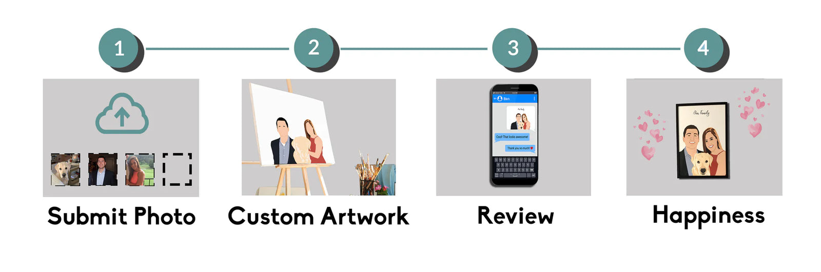 2) Custom Artwork: Sit back and relax while our team of artists create a personalized illustration of the photo(s) you submitted. We turn these around as quick as possible but since we create them specific to you it can take up to a week or so at time!